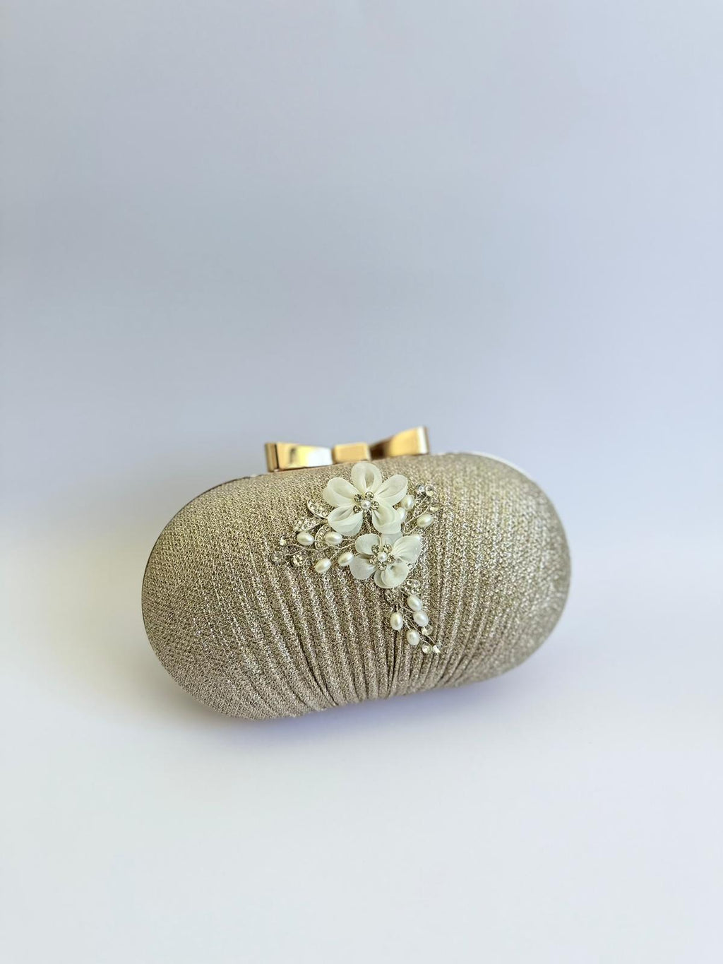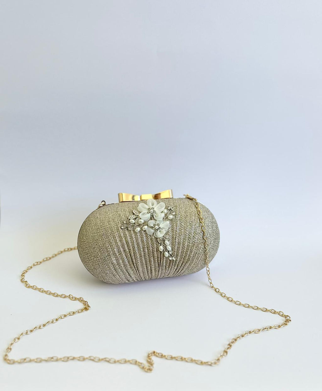 Featuring the JME signature 3D floral application, our bridal bag collection is versatile and chic coming with two detachable gold chains, one short and one long for easy shoulder styling or can be used as a stylish clutch. Drenched in shimmer and sparkle, the golden hue of this bag adds a luxurious and radiant glow to your bridal look.